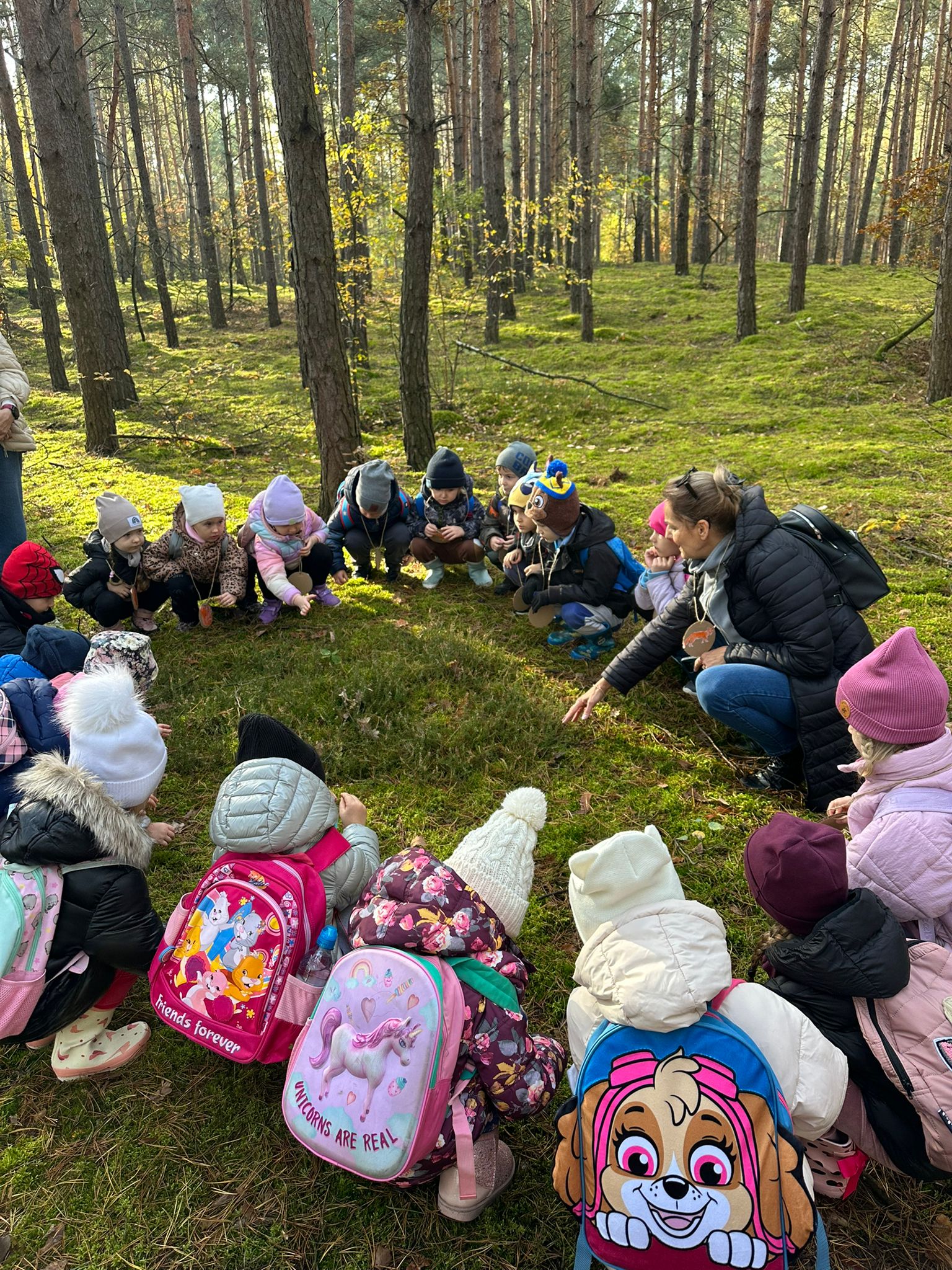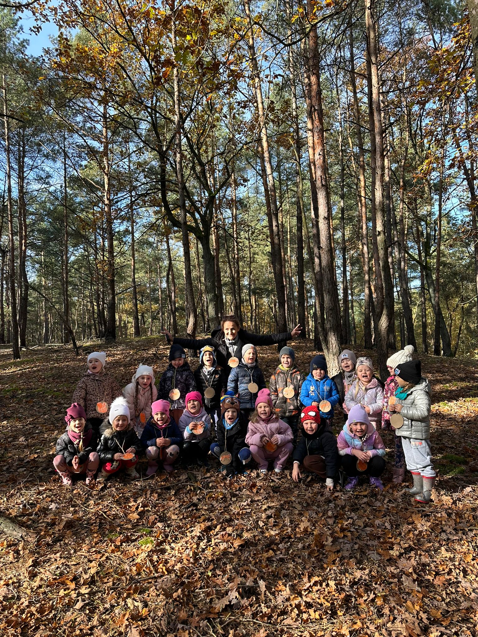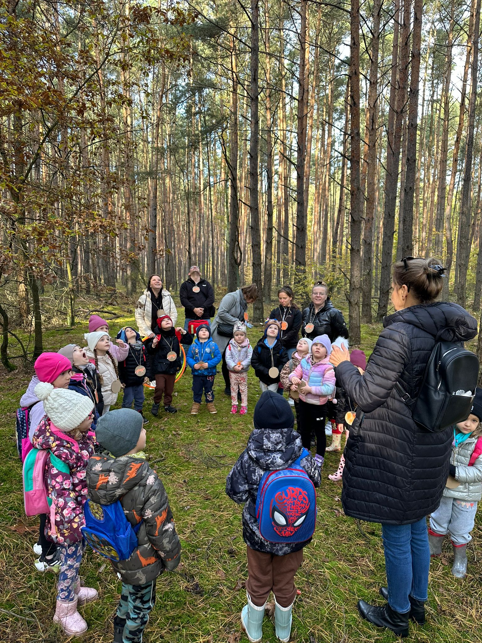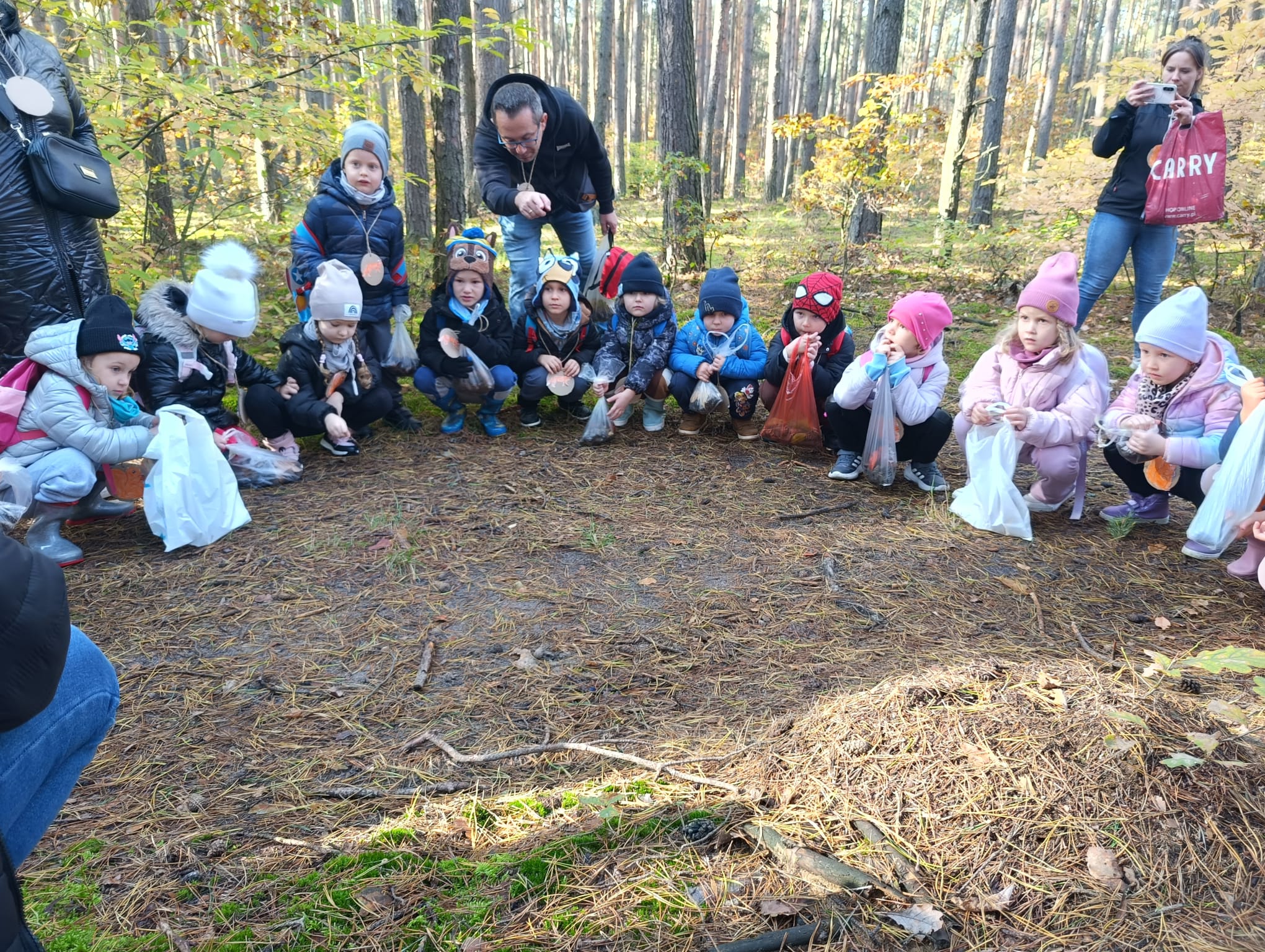 Na wycieczkę do jesiennego lasu zaprosiliśmy naszych rodziców. Nasza nauczycielka odczytała na początek list od pani Jesieni, która zaprosiła nas do poznania środowiska leśnego. Mianowała nas wiewiórkami i liskami. Każdy otrzymał emblemat ze zwierzątkiem (również rodzice i pani). Poznawaliśmy drzewa, poszycie i zwierzęta leśne. Widzielismy żuczki i mrówki. Zbieraliśmy dary lasu. Ale były też zabawy. POkonywaliśmy rożne przeszkody. Wiewiórki wskakiwały do dziupli a liski do nory. Rzucaliśmy szyszkami do celu. Zdobywaliśmy leśną górkę. Na koniec każdy otrzymał dyplom "Przyjaciela Lasu" i tuliliśmy się do drzew. Pozostawiliśmy porządek w lesie i z niechęcią wróciliśmy do autobusu.