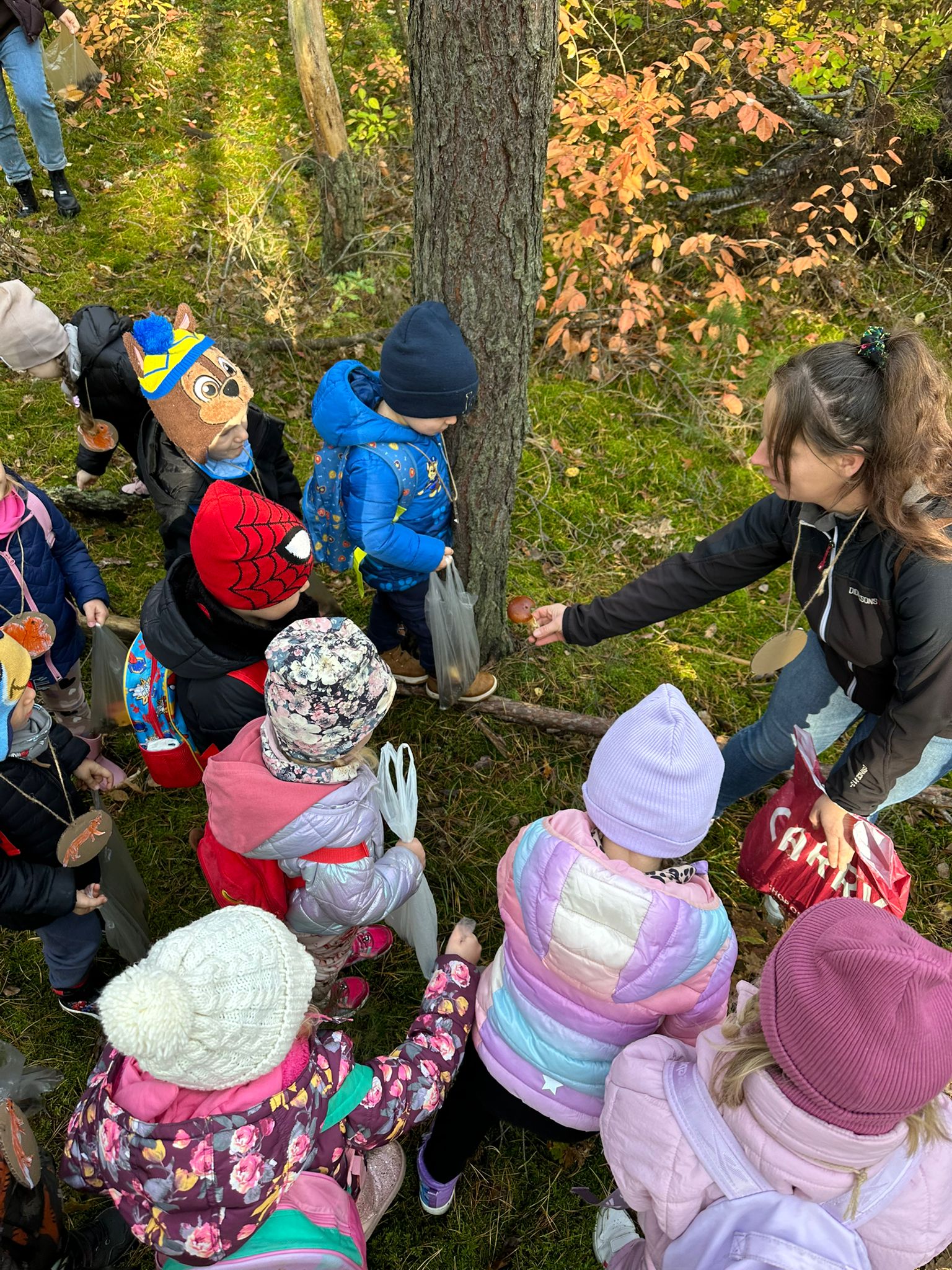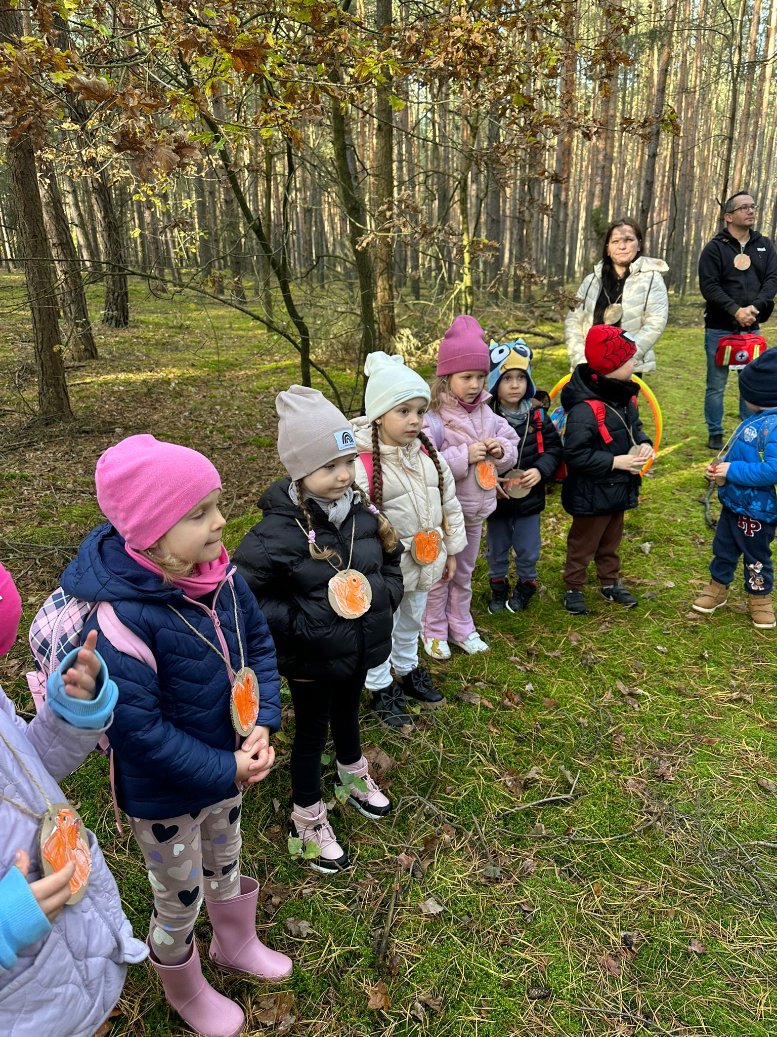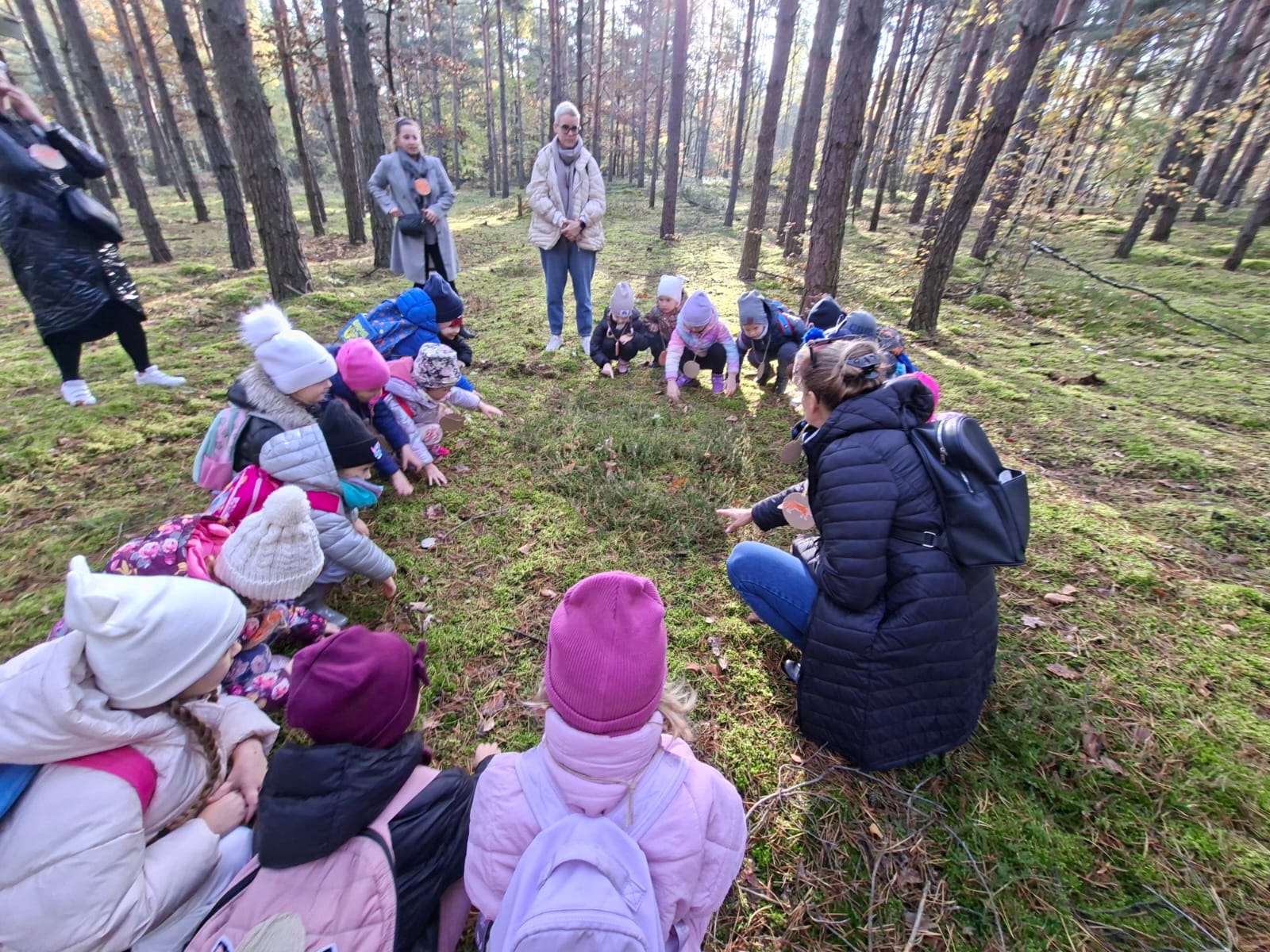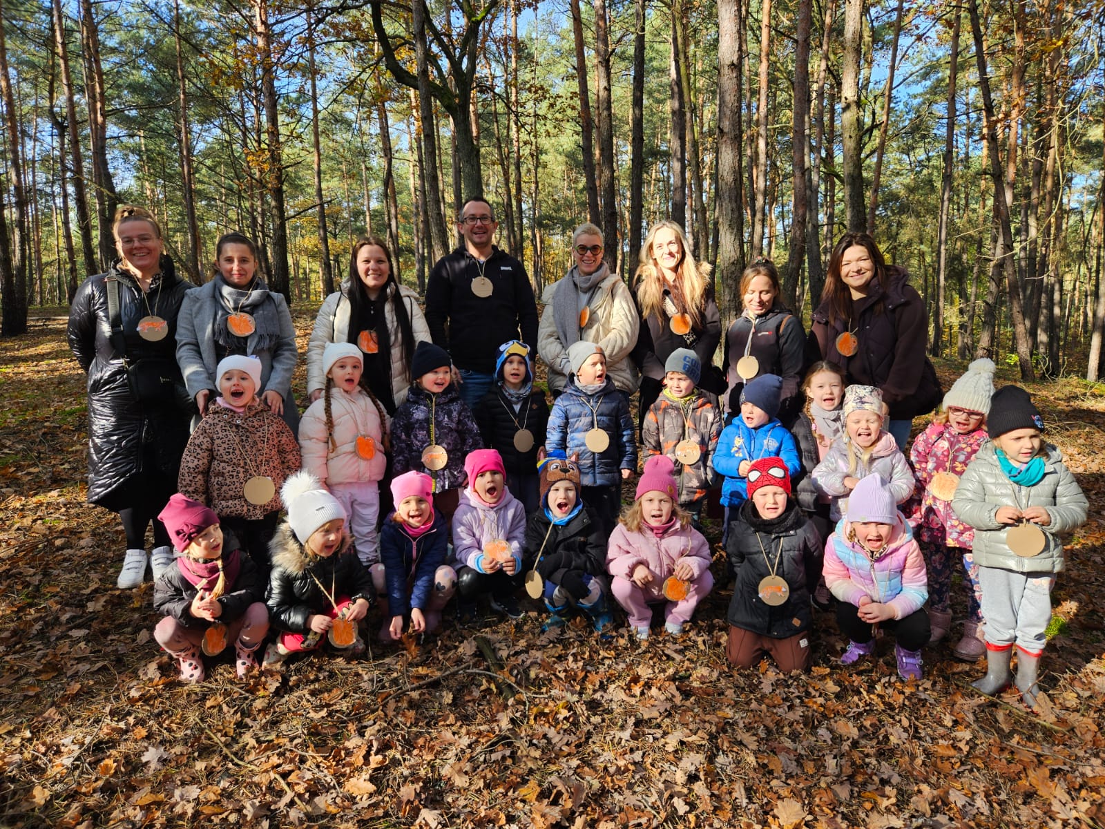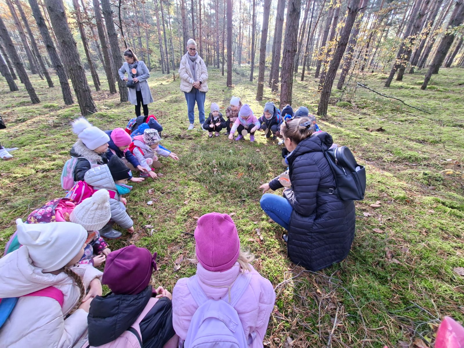 Na wycieczkę do jesiennego lasu zaprosiliśmy naszych rodziców. Nasza nauczycielka odczytała na początek list od pani Jesieni, która zaprosiła nas do poznania środowiska leśnego. Mianowała nas wiewiórkami i liskami. Każdy otrzymał emblemat ze zwierzątkiem (również rodzice i pani). Poznawaliśmy drzewa, poszycie i zwierzęta leśne. Widzielismy żuczki i mrówki. Zbieraliśmy dary lasu. Ale były też zabawy. POkonywaliśmy rożne przeszkody. Wiewiórki wskakiwały do dziupli a liski do nory. Rzucaliśmy szyszkami do celu. Zdobywaliśmy leśną górkę. Na koniec każdy otrzymał dyplom "Przyjaciela Lasu" i tuliliśmy się do drzew. Pozostawiliśmy porządek w lesie i z niechęcią wróciliśmy do autobusu.